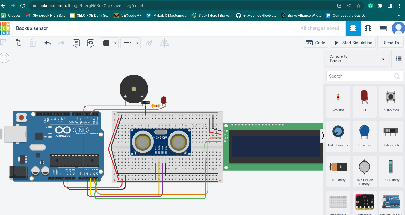 The system works by using a distance sensor to measure the distance from the back of the car to an object and sends that information to the Arduino which tells The LCD to display either Go, Object detected, or STOP NOW. If the stop now code is triggered it flashes the LED on and off and tells the buzzer to make noise it also flashes STOP NOW on the LCD. There is also a slide switch that let’s us choose between an audible alert of the LED.