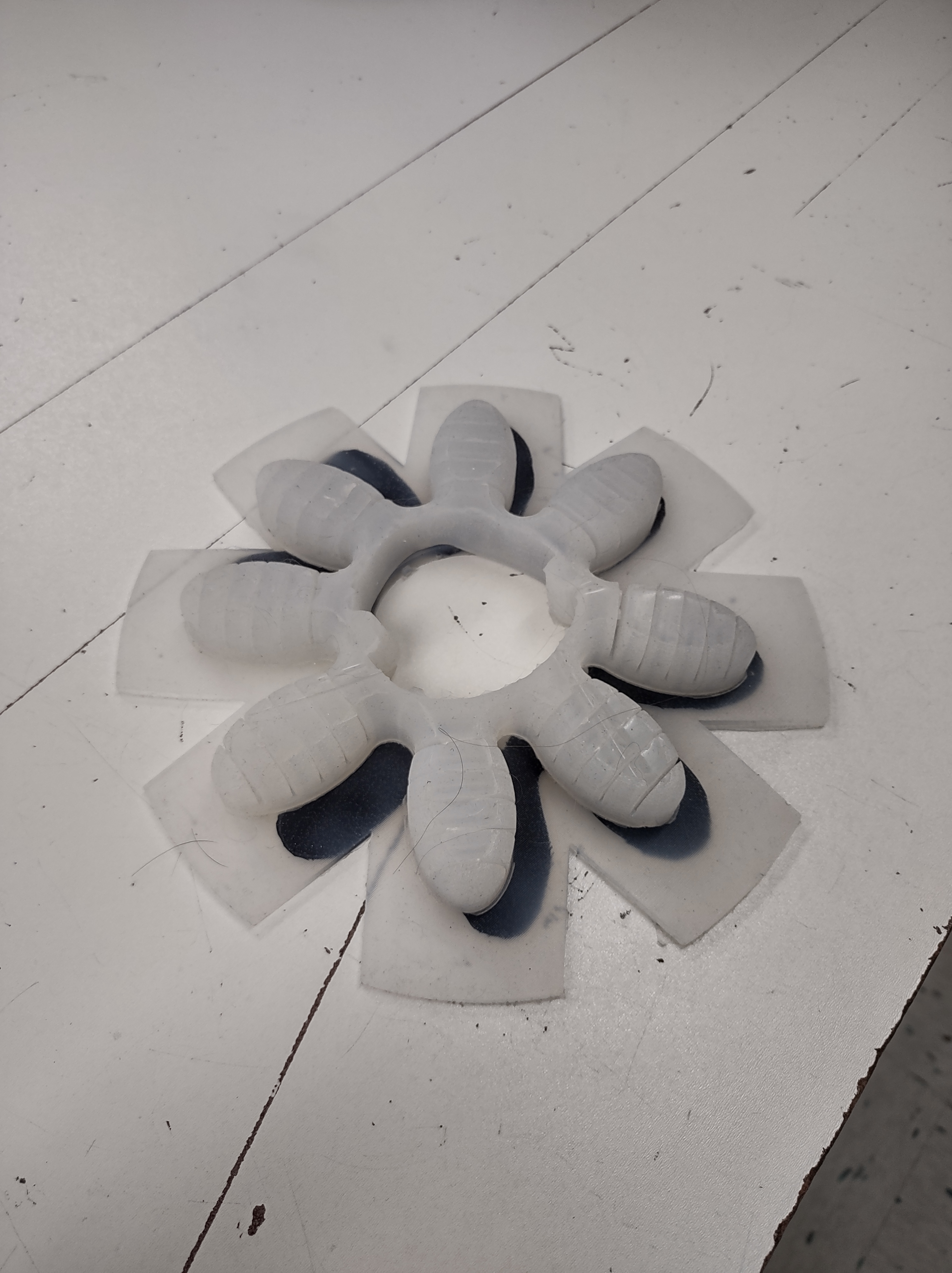 The robot is made of 3 main components the soft skirt and arms, the center housing, and the circuitry. these components are built separately and then assembled at the end.